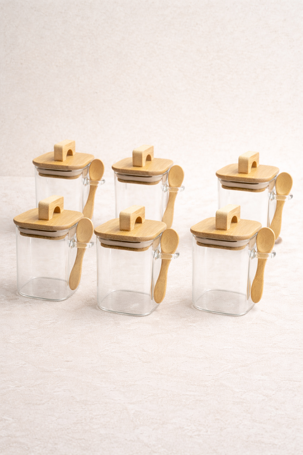 Akasya Conta Kapaklı Kaşıklı 6'lı Borosilikat 300ml Kare Kavanoz Seti KW-795