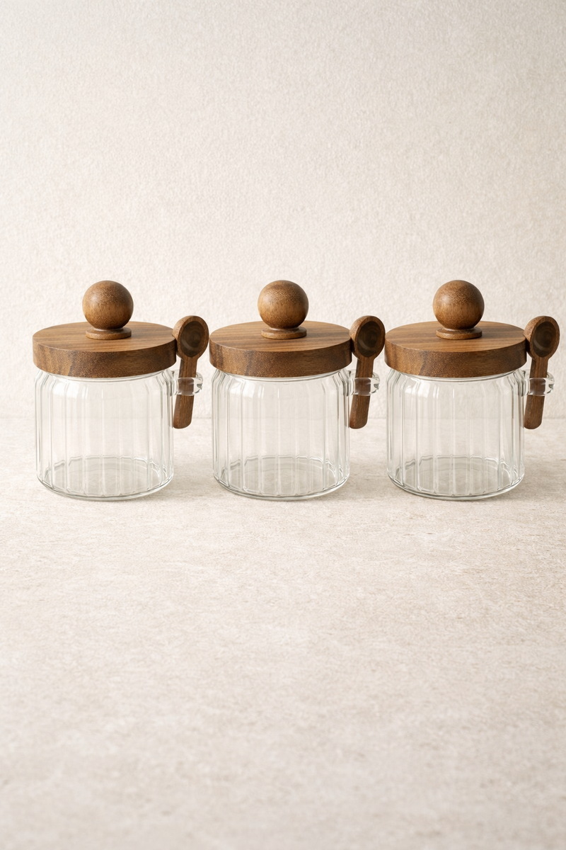 Akasya Contalı Kaşıklı Çizgili 3'lü Cam Kavanoz Doğal Ahşap Kapaklı Saklama Kavanozu Seti KW-752