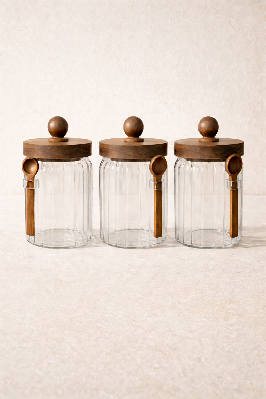 Akasya Contalı Kaşıklı Çizgili 3'lü Cam Kavanoz Doğal Ahşap Kapaklı Saklama Kavanozu Seti KW-753
