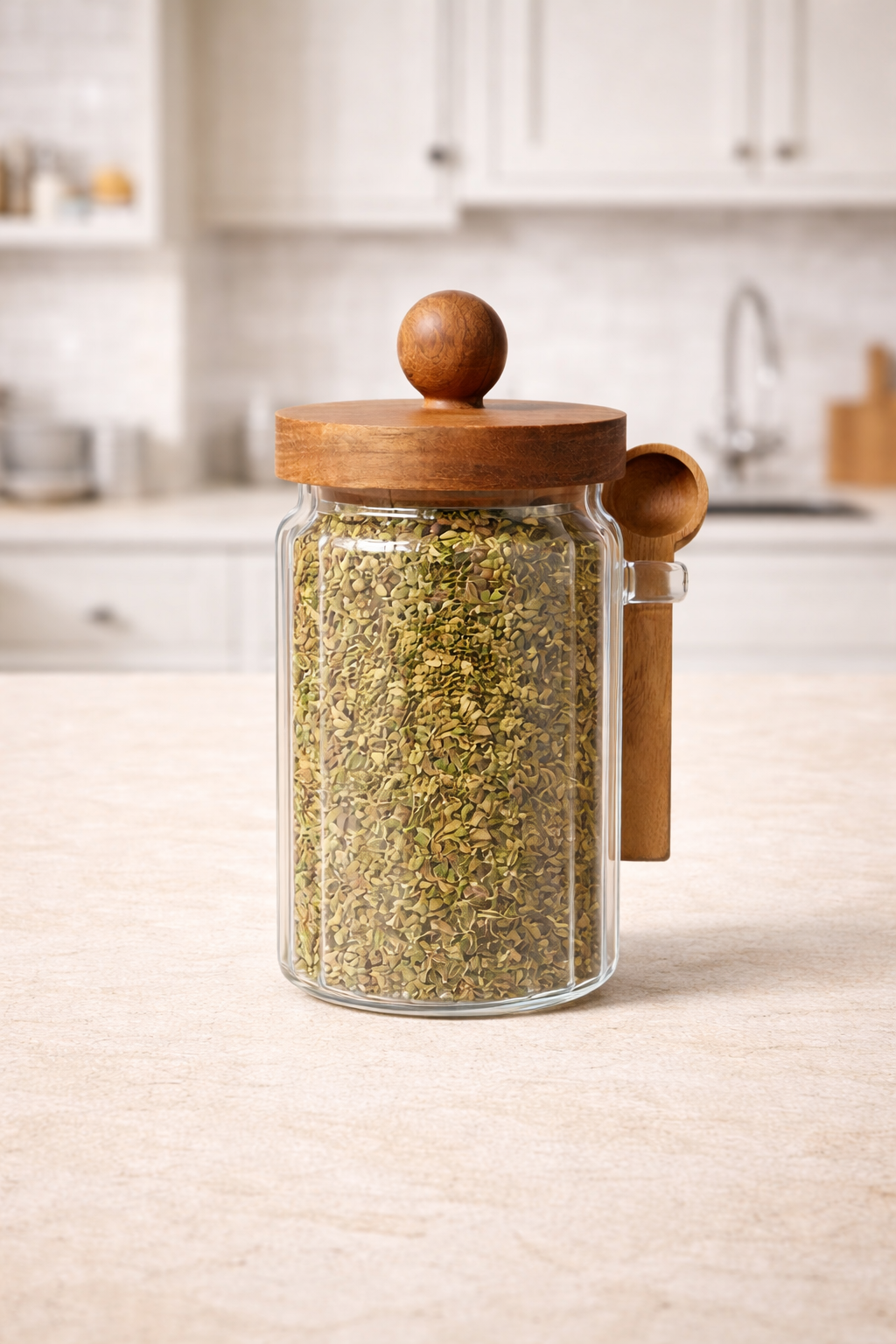 Silikon contalı akasya kapak, kavanozun kapağını sıkıca kapatarak içeriğin tazeliğinin korunmasına yardımcı olur. Çizgili cam tasarımı estetik bir görünüm sunarken, şeffaf yapısı sayesinde içerisindeki ürünler kolayca görülebilir. Ahşap kaşığı sayesinde kullanım kolaylığı sağlar ve özellikle şeker, kahve, tuz, baharat ve kuru gıdalar için idealdir.