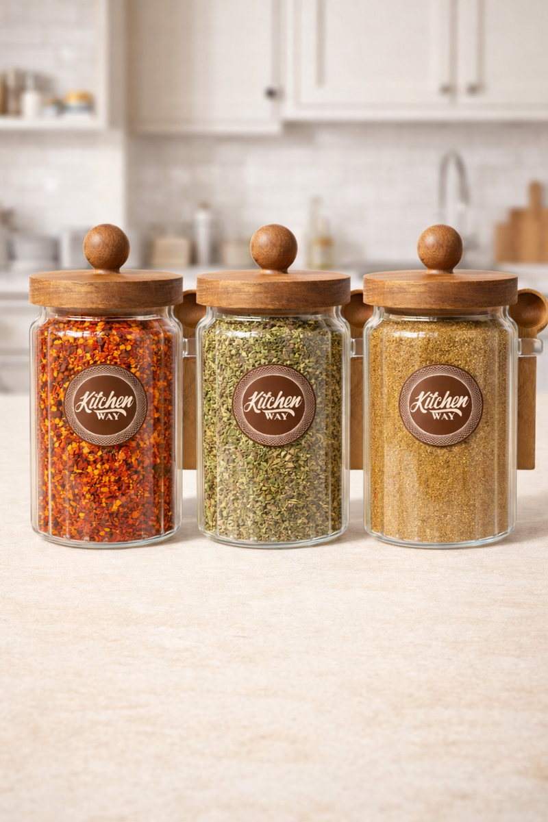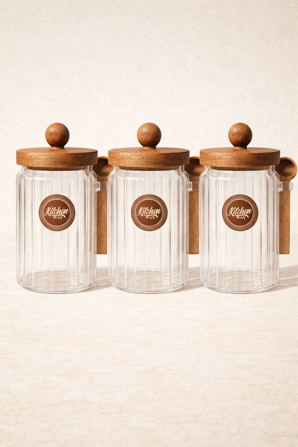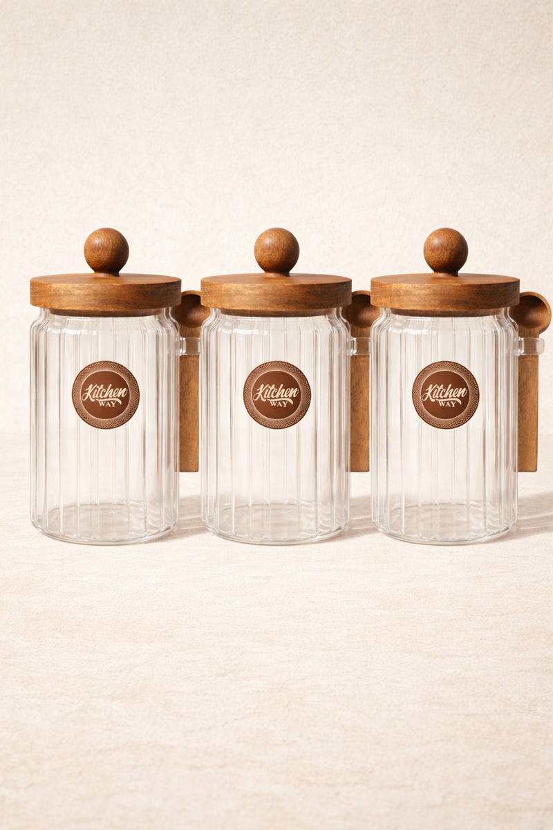 Akasya Contalı Kaşıklı Çizgili 3'lü Cam Kavanoz Doğal Ahşap Kapaklı Saklama Kavanozu Seti KW-754 (Kopya)