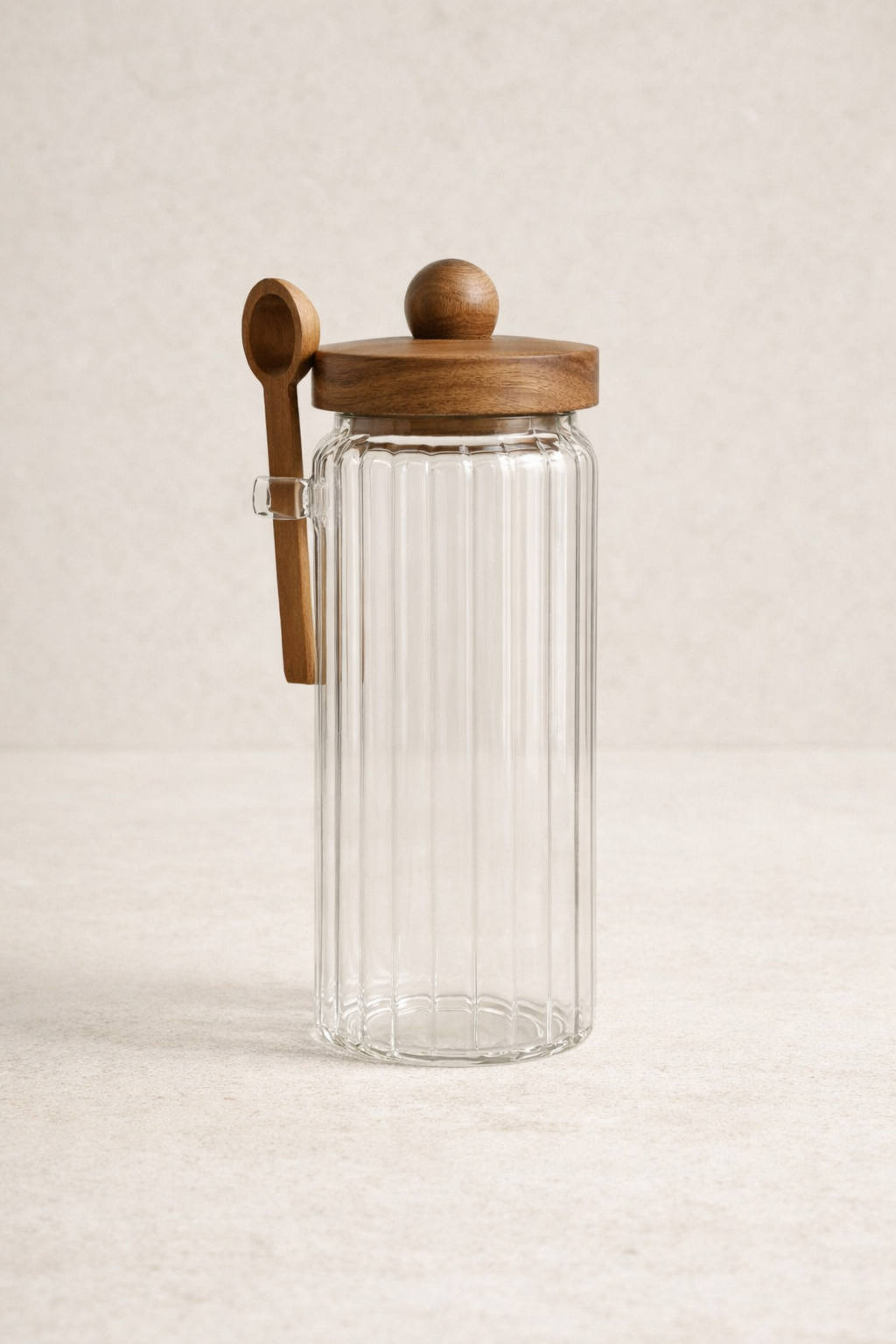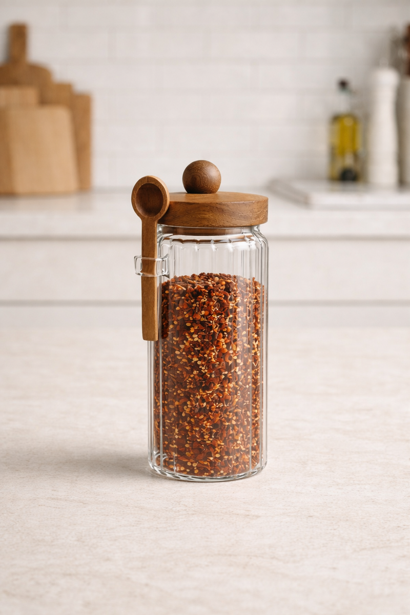 Silikon contalı akasya kapak, kavanozun kapağını sıkıca kapatarak içeriğin tazeliğinin korunmasına yardımcı olur. Çizgili cam tasarımı estetik bir görünüm sunarken, şeffaf yapısı sayesinde içerisindeki ürünler kolayca görülebilir. Ahşap kaşığı sayesinde kullanım kolaylığı sağlar ve özellikle şeker, kahve, tuz, baharat ve kuru gıdalar için idealdir.