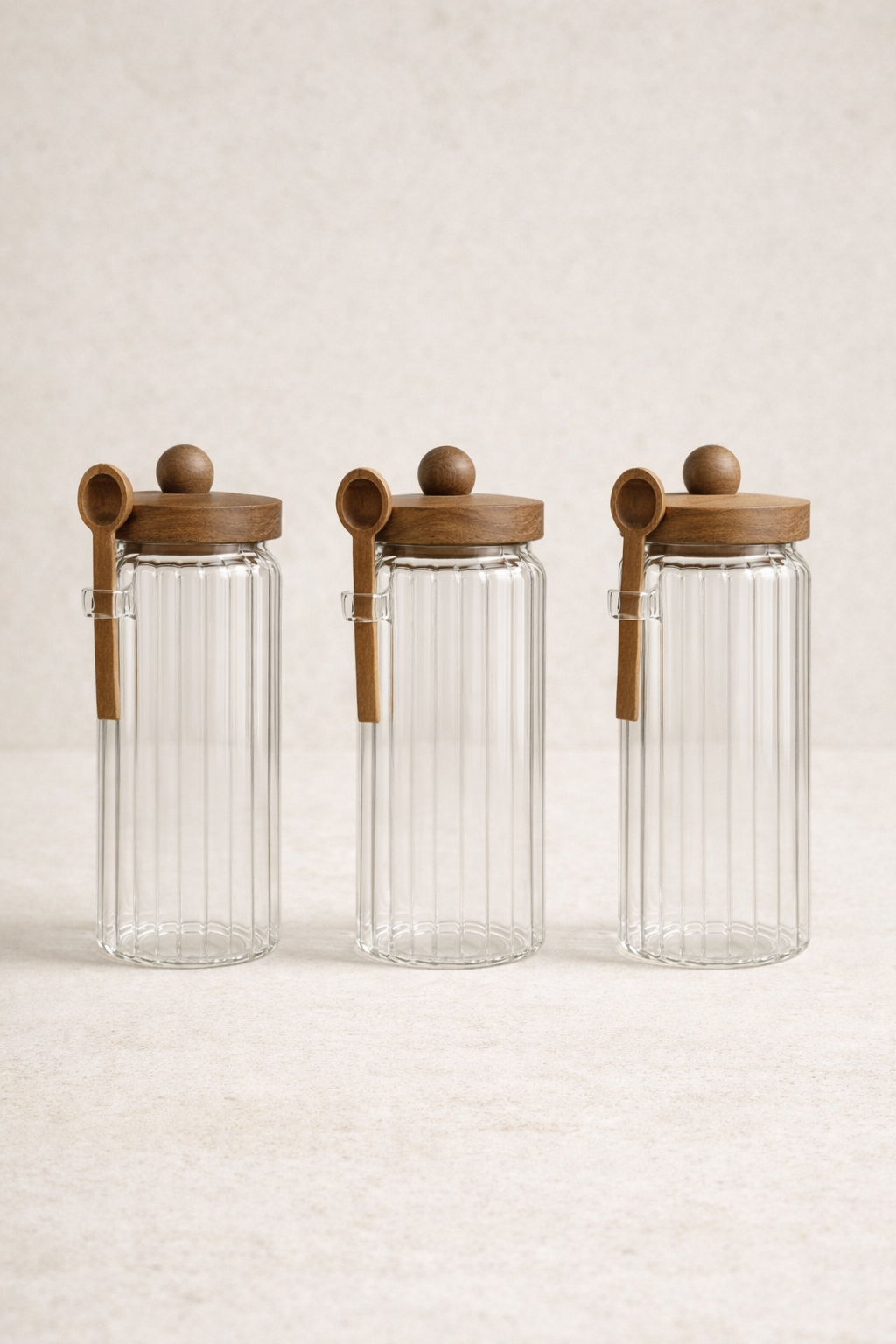 Akasya Contalı Kaşıklı Çizgili 3'lü Cam Kavanoz Doğal Ahşap Kapaklı Saklama Kavanozu Seti KW-755