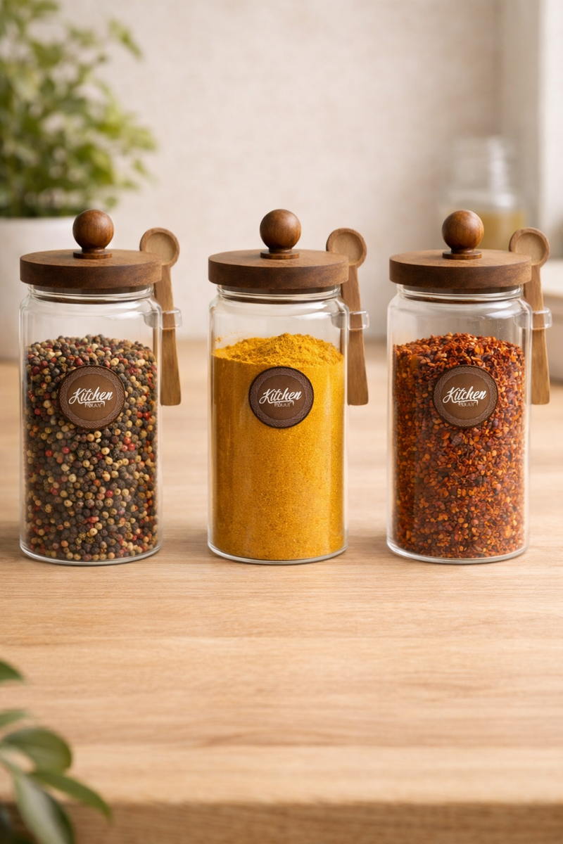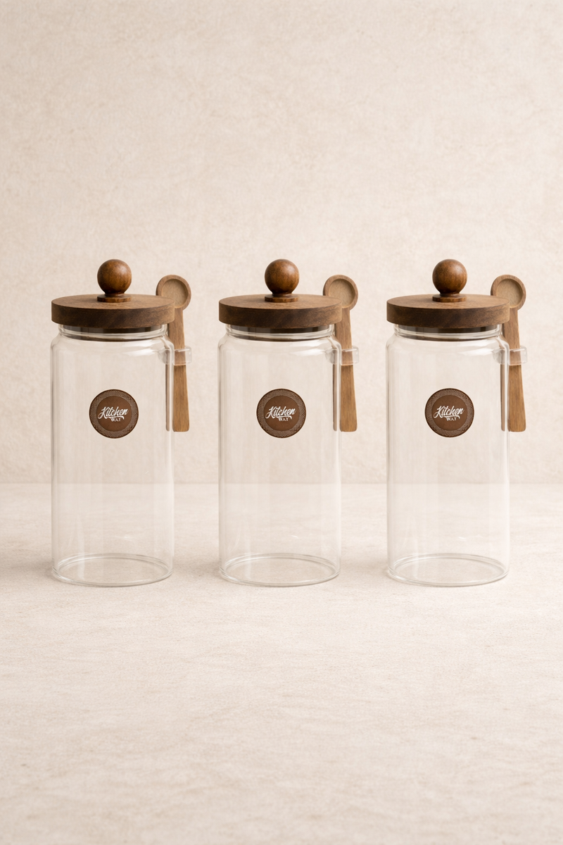 Akasya Kaşıklı Conta Kapaklı 3'lü Kavanoz Baharatlık Seti KW-737