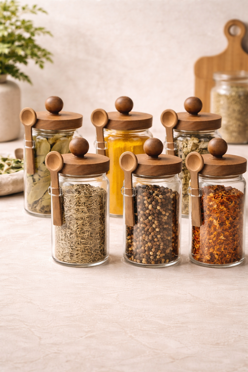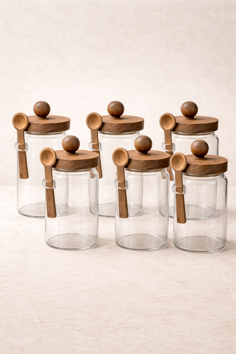 Akasya Kaşıklı Conta Kapaklı 6'lı Kavanoz Baharatlık Seti KW-736