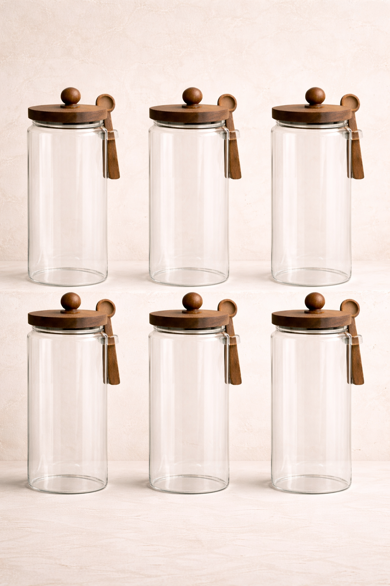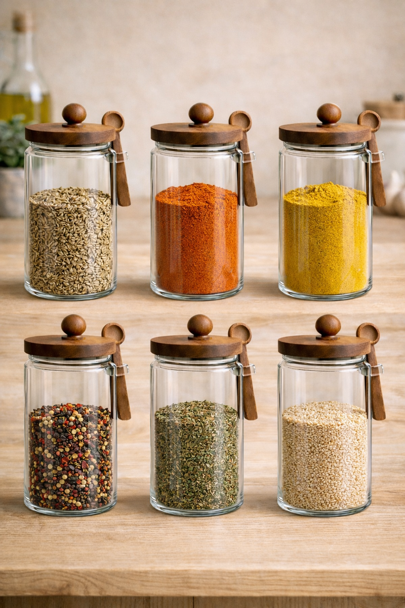 Akasya Kaşıklı Conta Kapaklı 6'lı Kavanoz Baharatlık Seti KW-737