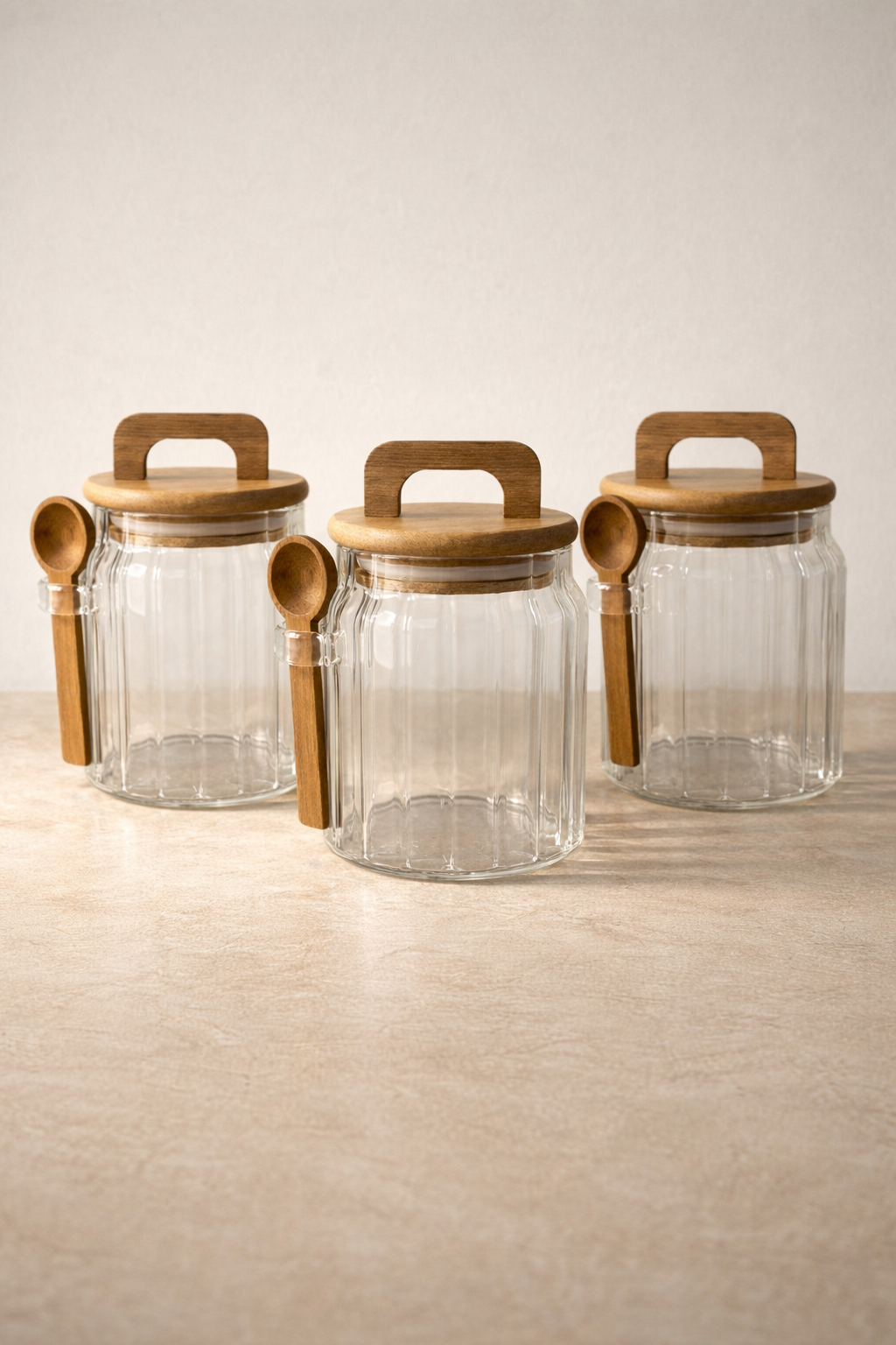 Akasya Kaşıklı Conta Kapaklı Çizgi Desenli 500ML 3lü Kavanoz Seti KW-1170