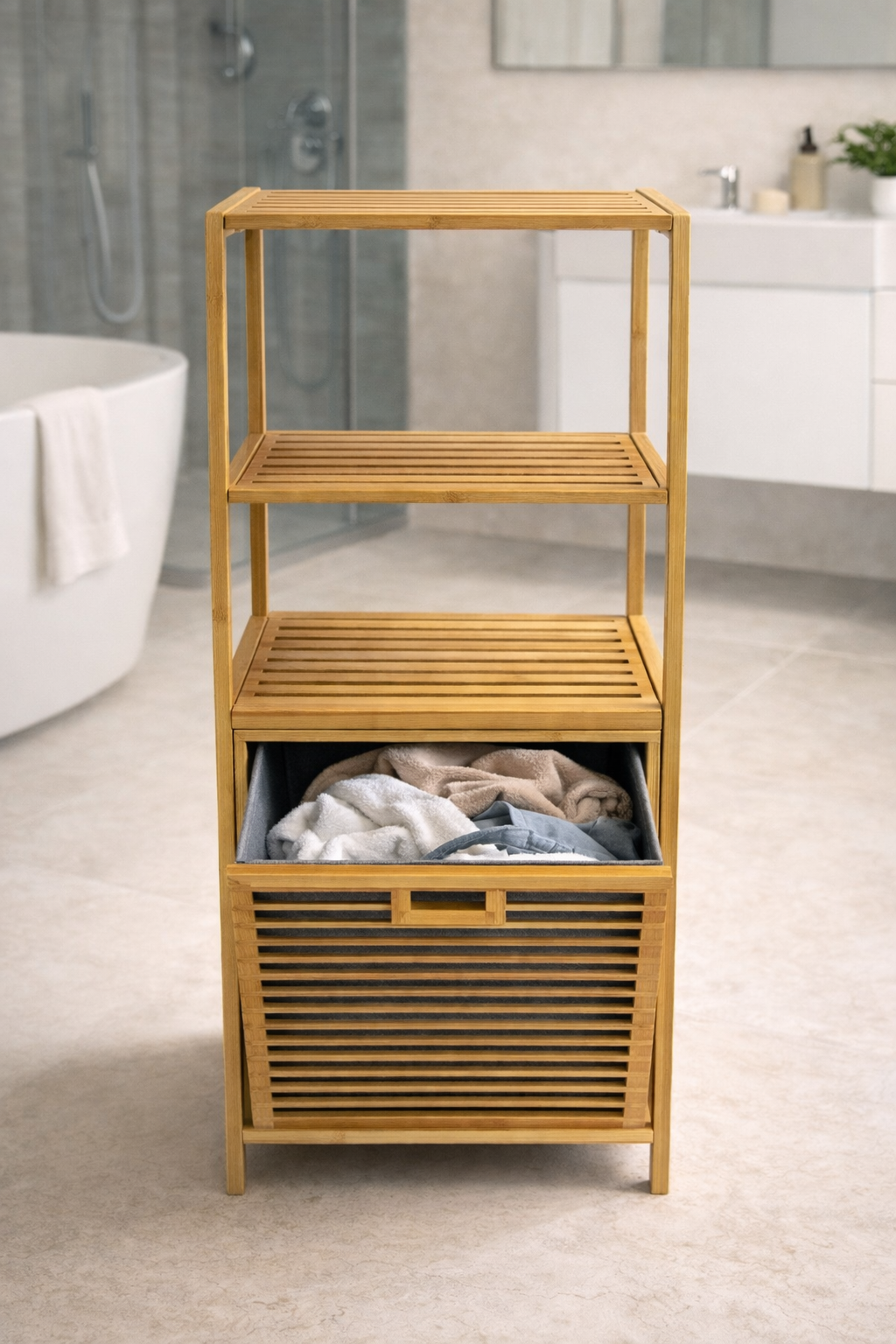 Doğal bambu malzemeden üretilen çamaşır sepeti, banyonuza ve yaşam alanlarınıza şık ve düzenli bir görünüm kazandırır.