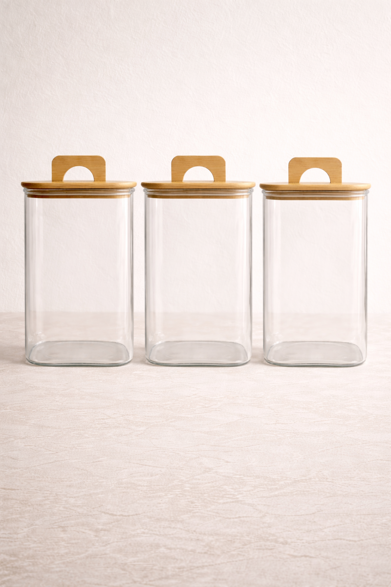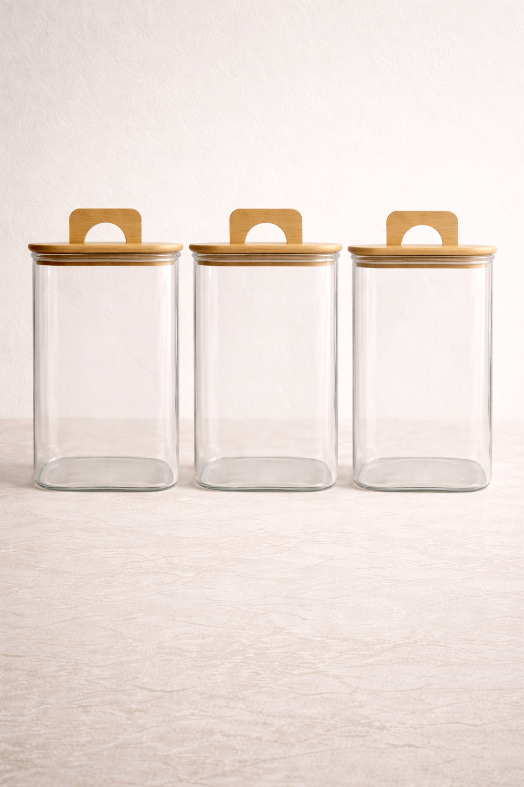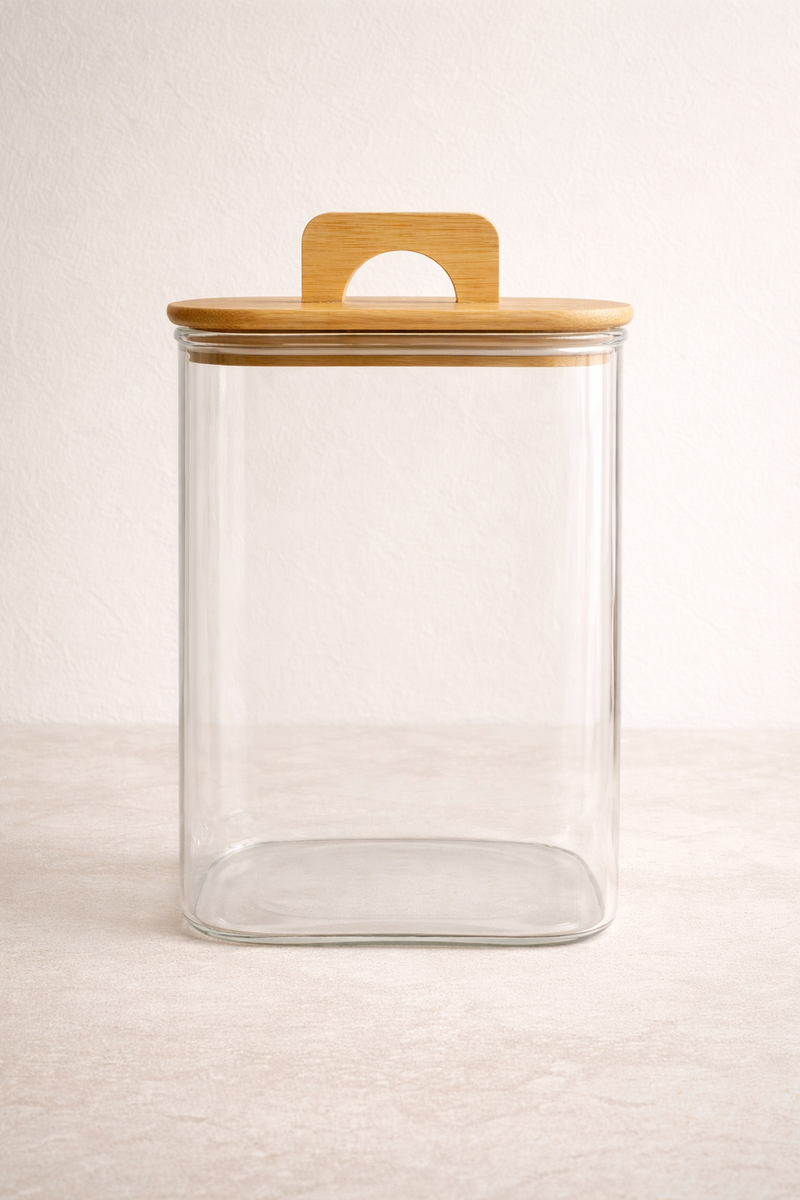 Bambu Conta Kapaklı Borosilikat 1200ml Kare Kavanoz KW-780