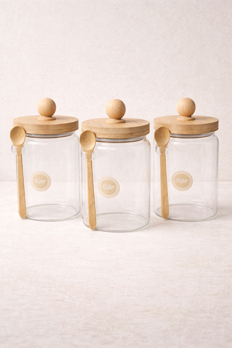Bambu Kaşıklı Conta Kapaklı 3'lü Kavanoz Baharatlık Set KW-739