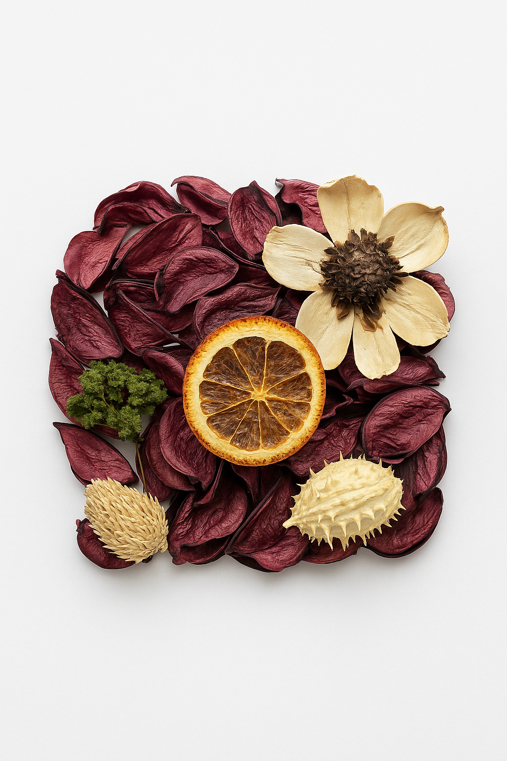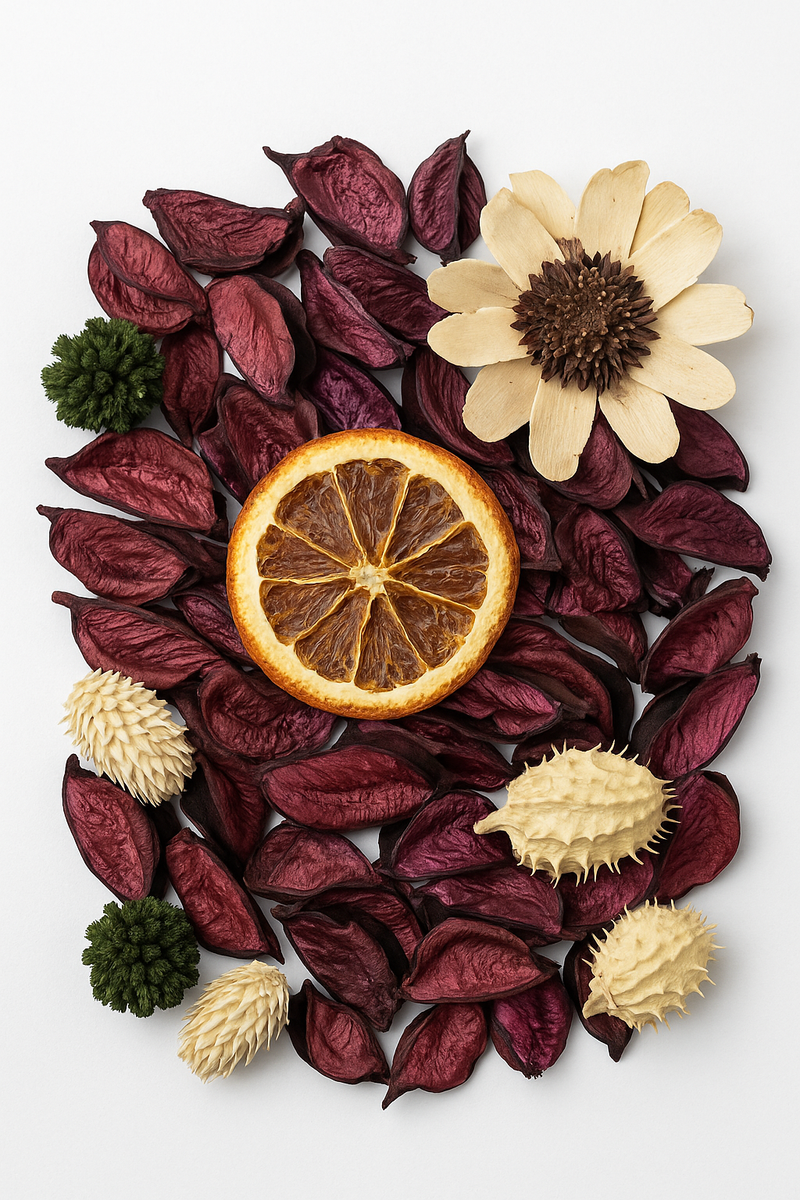 - İçerik: Kuru çiçek yaprakları, kuru çiçekler, kuru meyve dilimleri ve dekoratif doğal parçalar