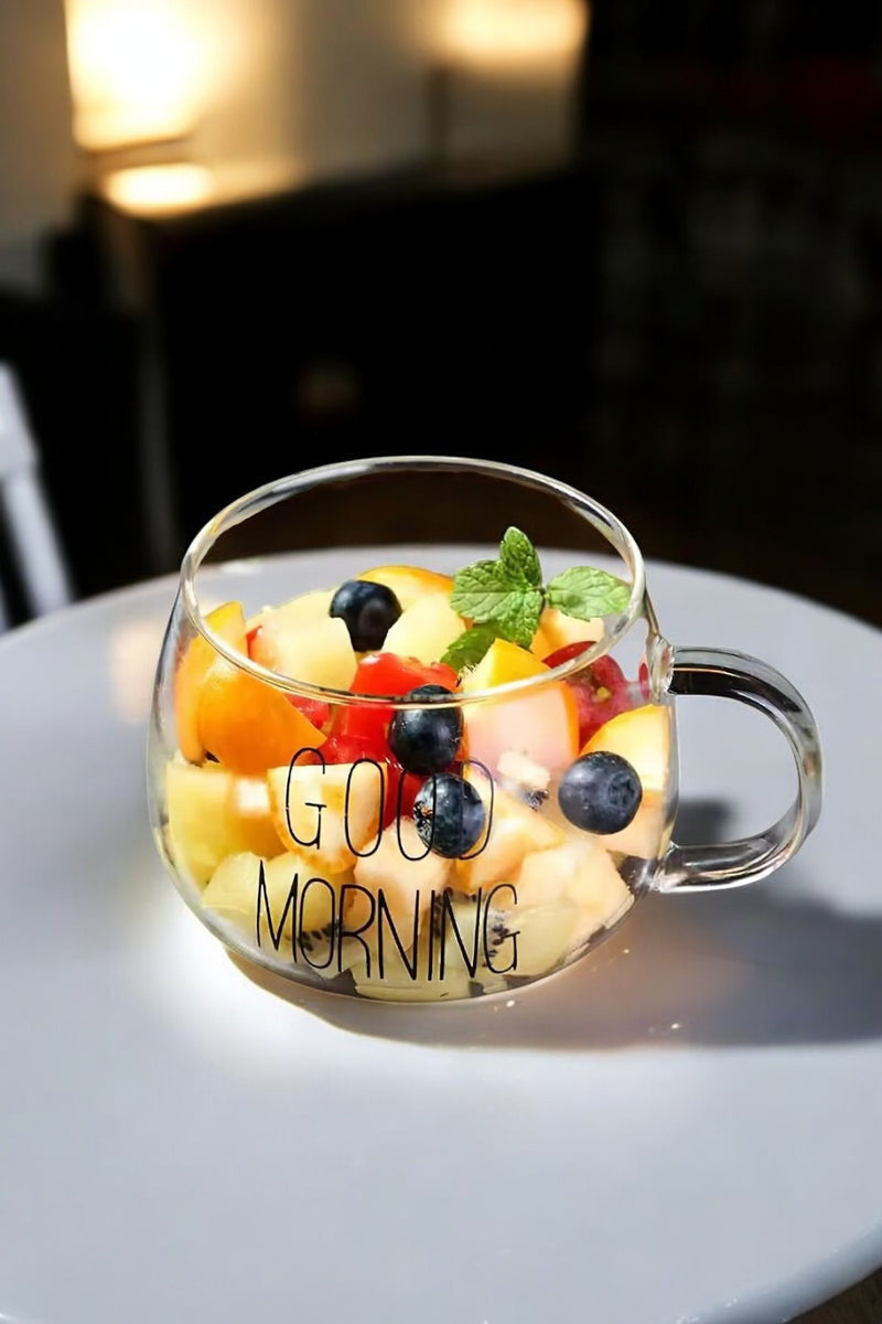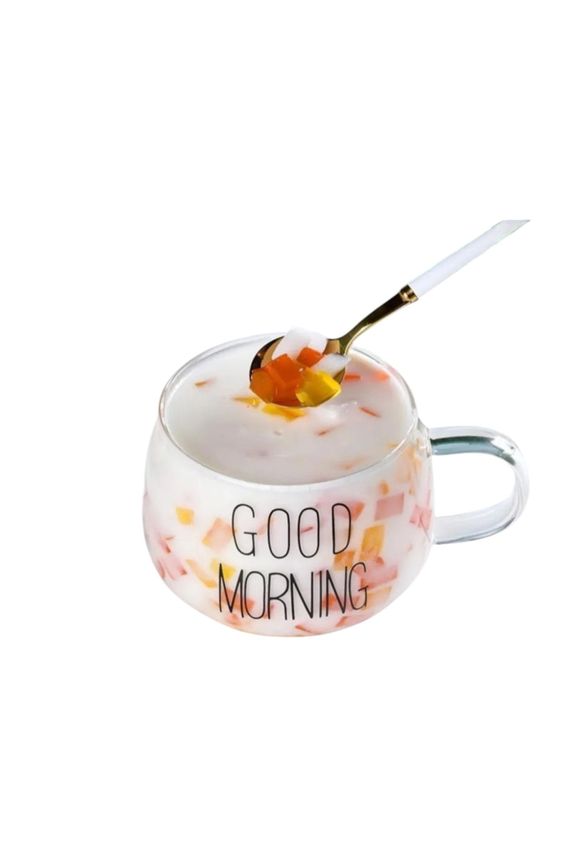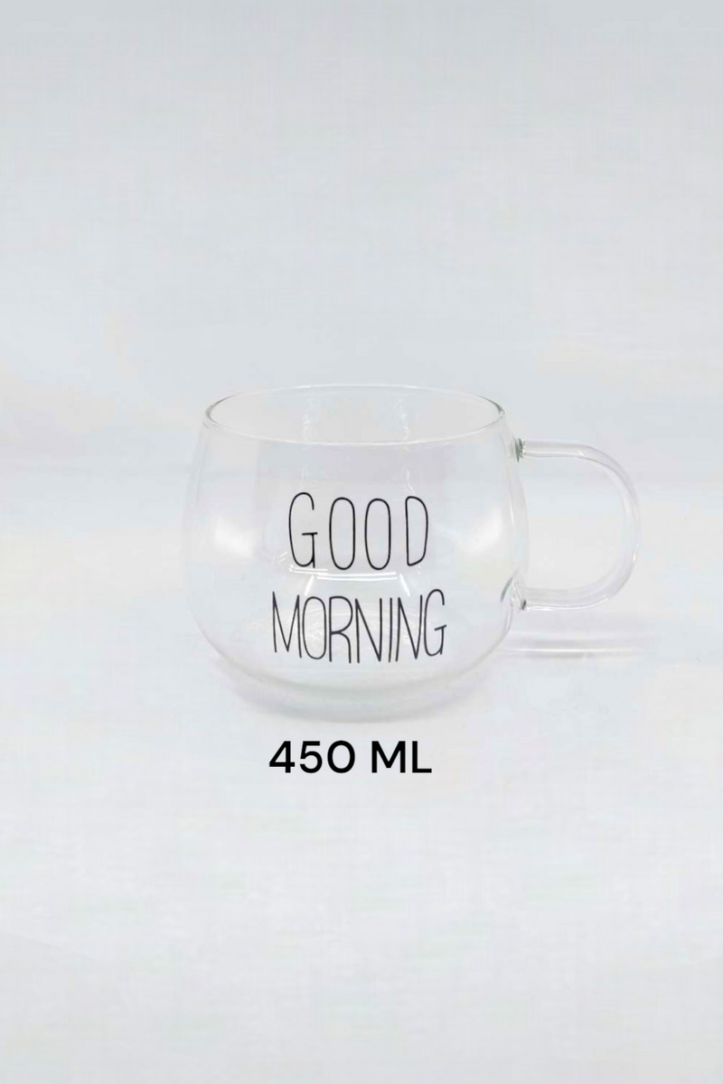 Cam Good Morning Kulplu 2 Li Yuvarlak 450ML Kupa Borosilikat Sunumluk Meşrubat Bardak KW-064