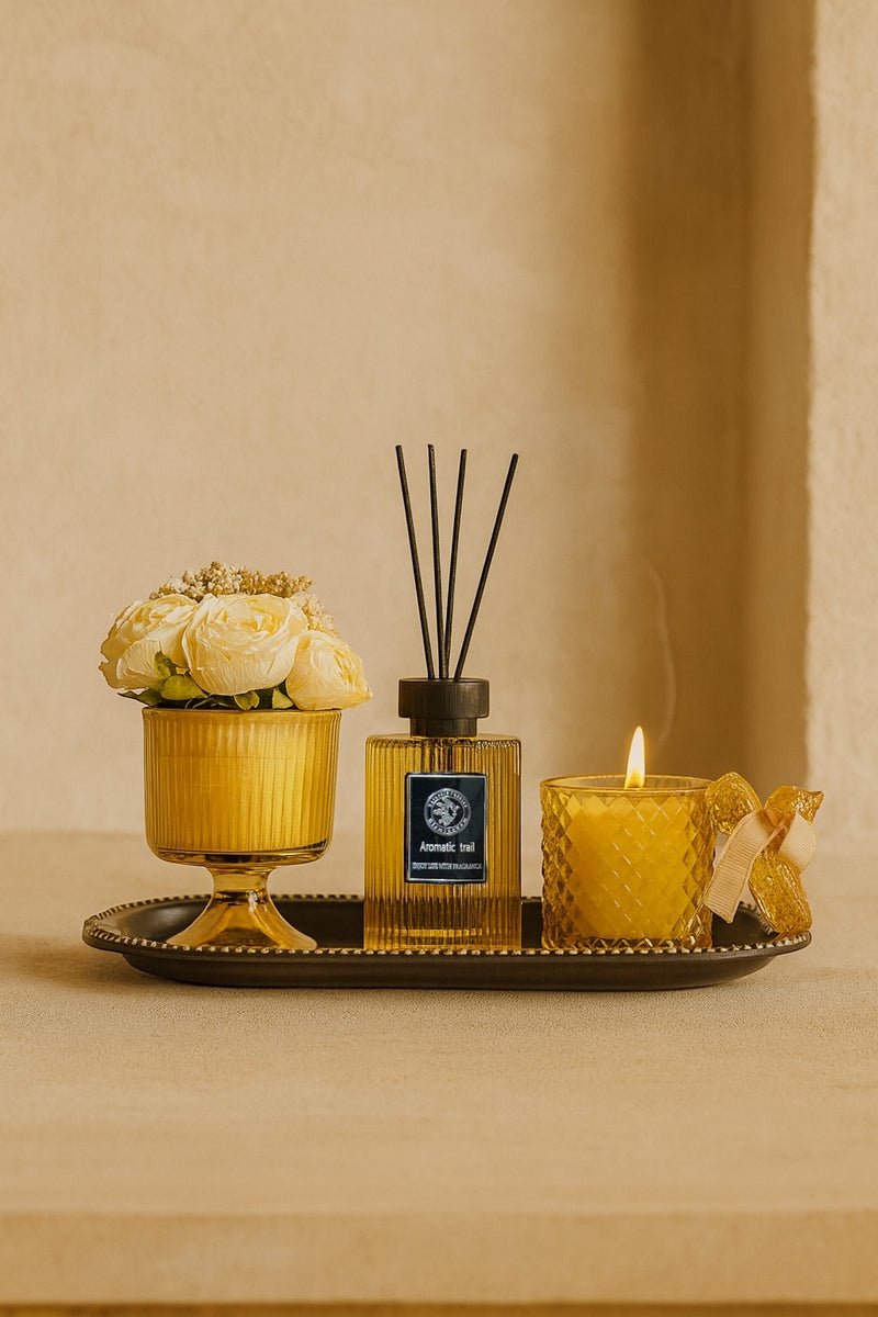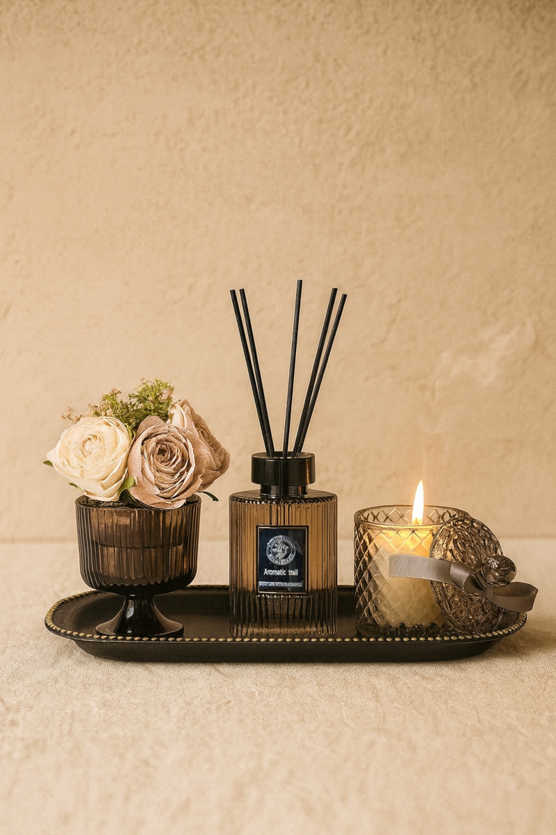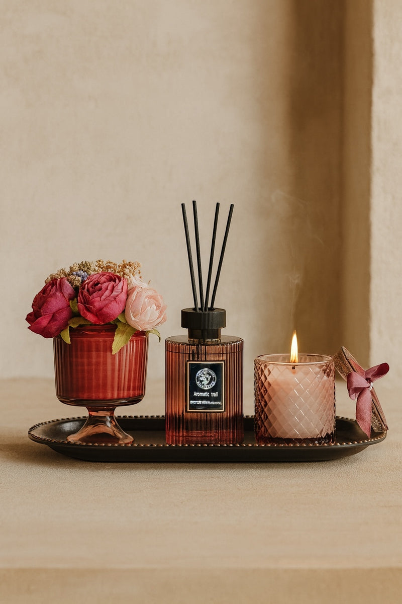 Çubuklu Koku Mum Çiçek ve Tepsi Dekoratif Set SHN-2053