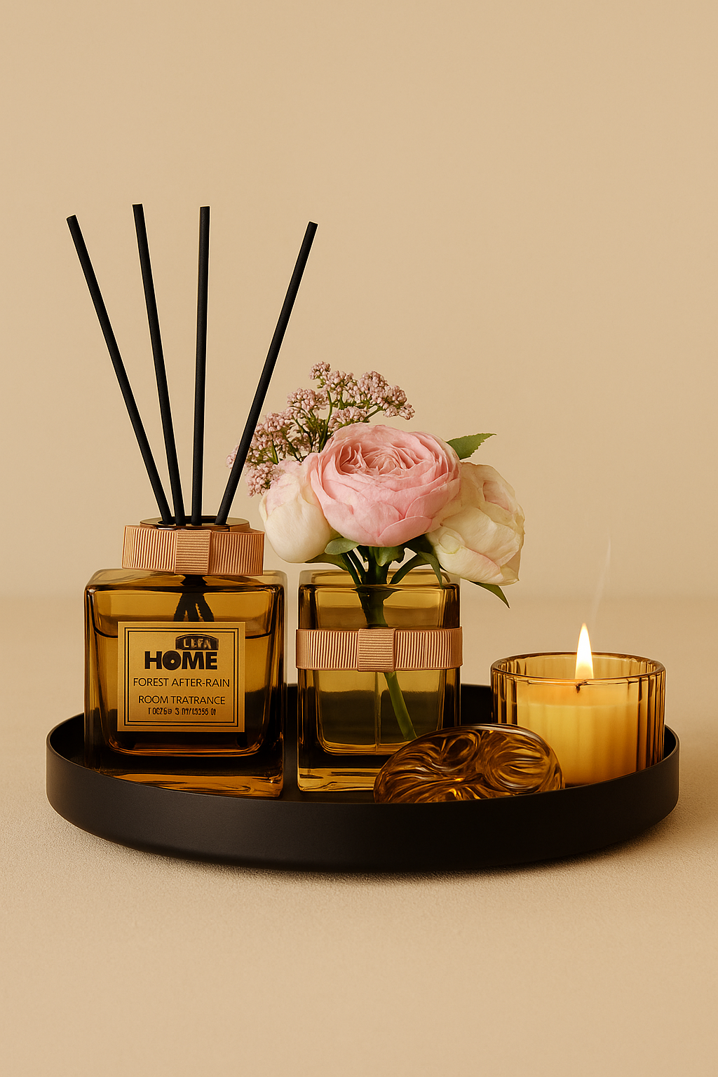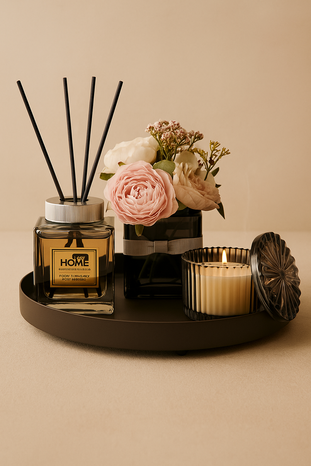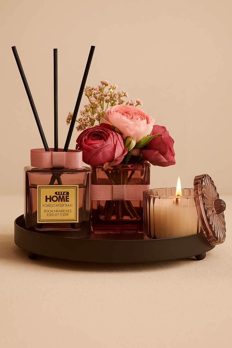 Çubuklu Koku Mum Çiçek ve Tepsi Dekoratif Set SHN-2059