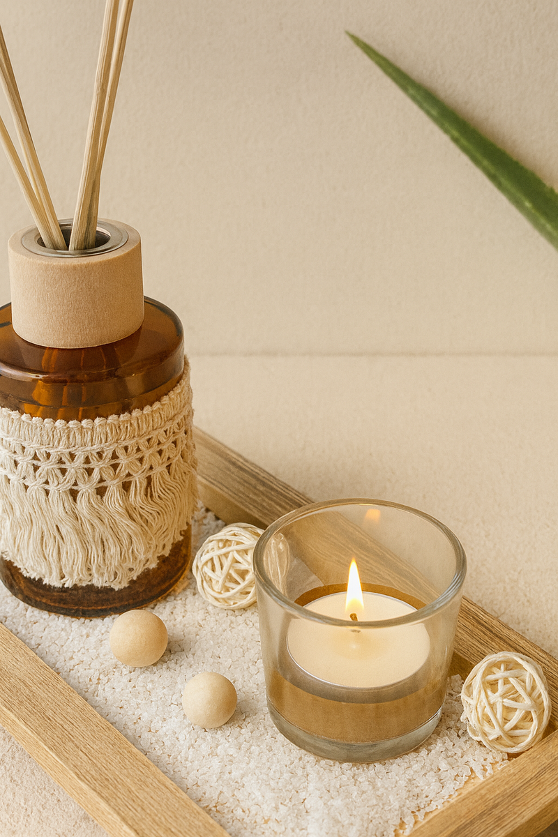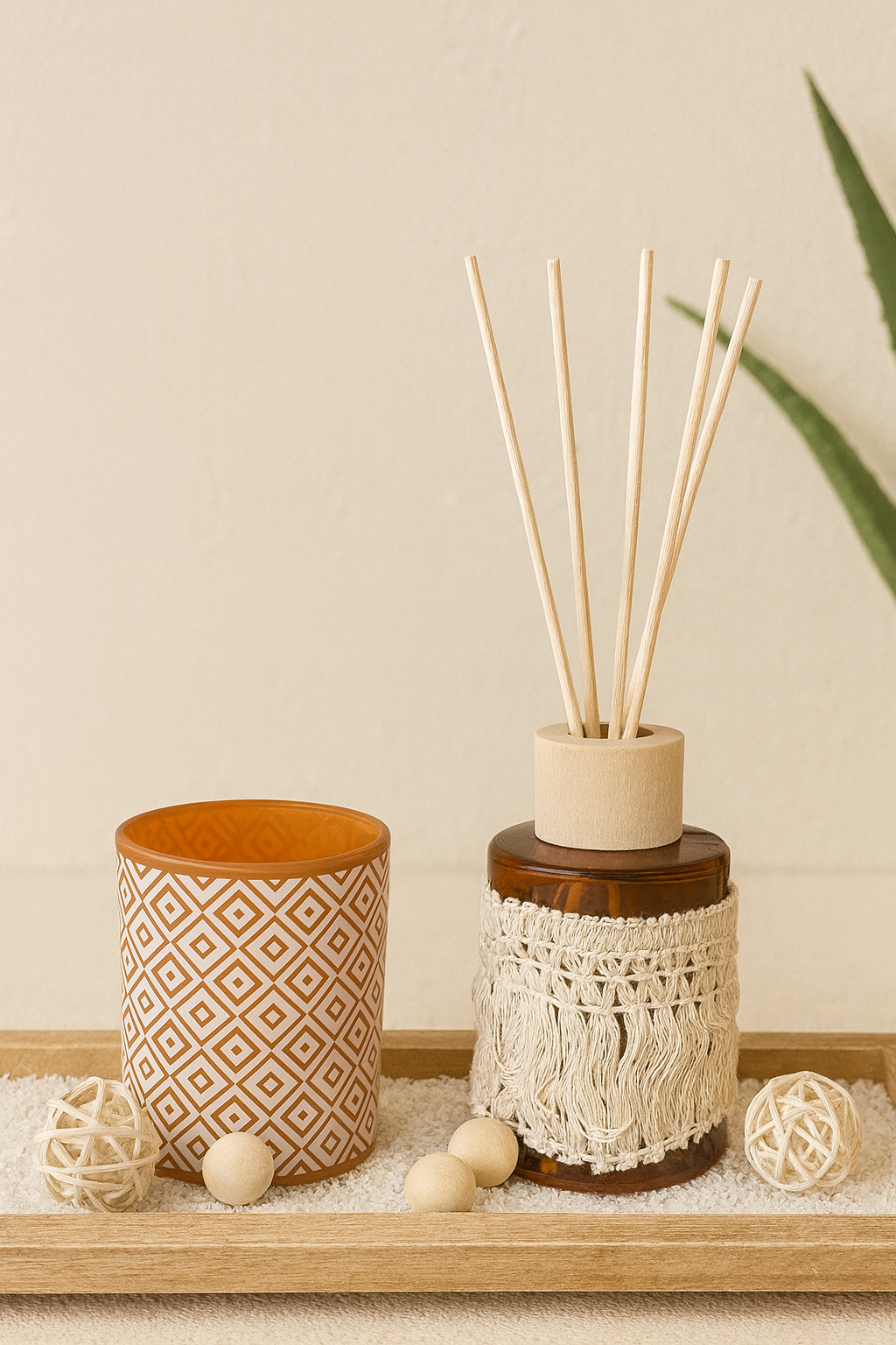 Evinizde sade zarafeti ve huzurlu bir atmosferi bir araya getiren bu özel set, doğallığıyla yaşam alanlarınıza sıcak bir enerji katmak için tasarlandı. El işçiliği detaylı makrome kaplı amber cam şişesiyle oda kokusu difüzörü, dekoratif dokusu kadar hoş kokusuyla da ortama dinginlik kazandırır. Setin tamamlayıcısı olan iki farklı boy mum, yumuşak ışıklarıyla rahatlatıcı bir ambiyans oluşturur.