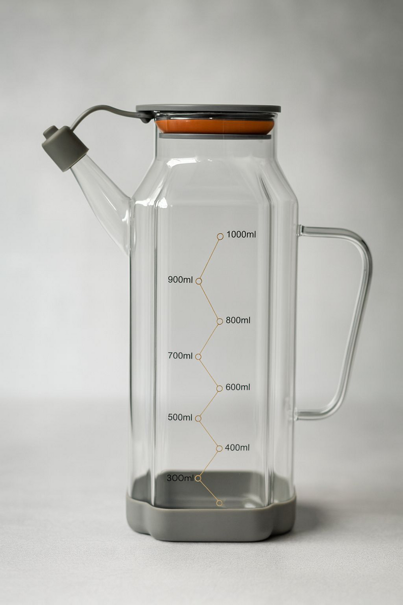 Yüksek kaliteli borosilikat camdan üretilen bu 1000 ml kapasiteli yağlık, hem şık görünümü hem de fonksiyonelliğiyle mutfakta fark yaratır.