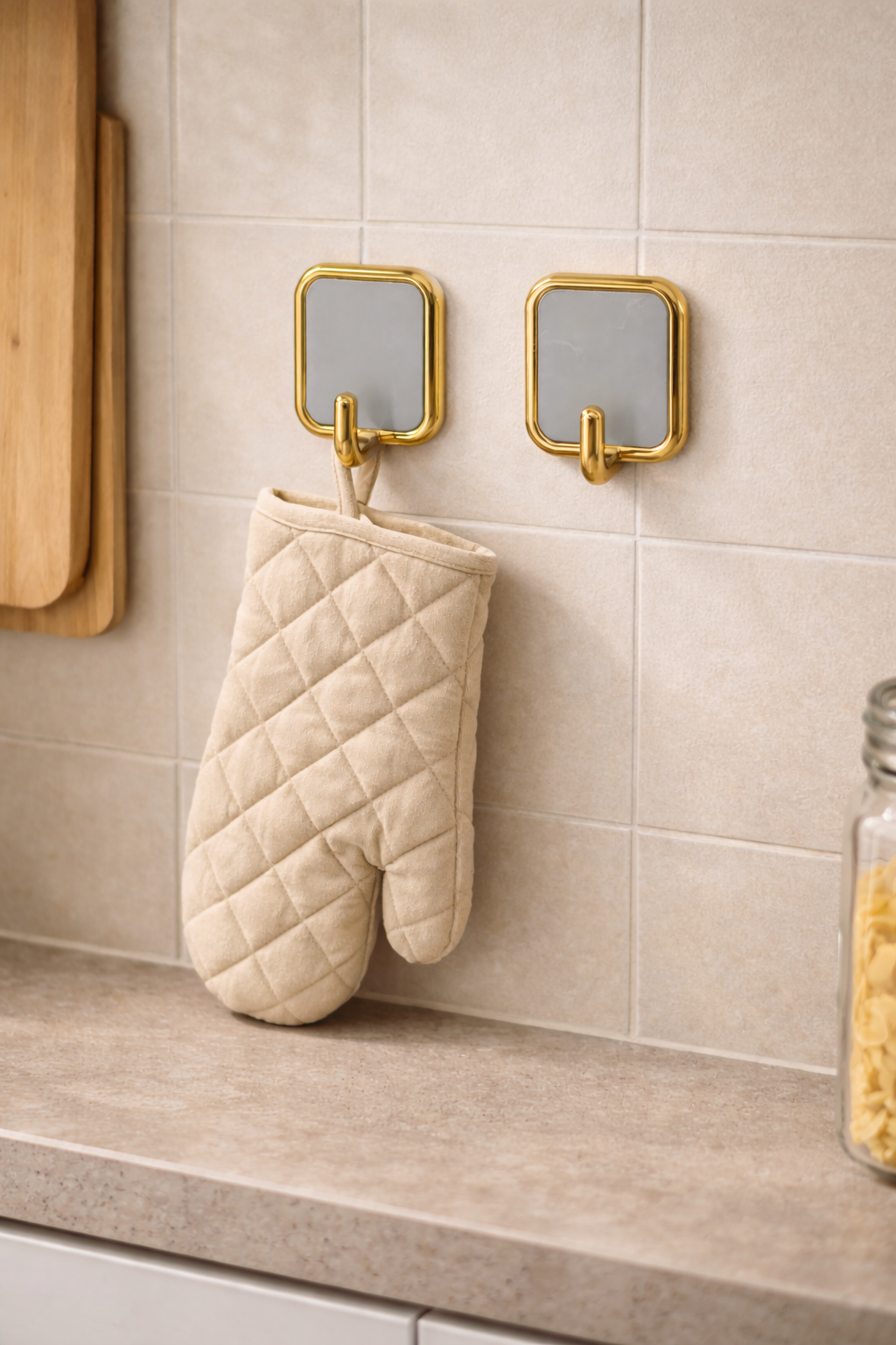 Modern kare tasarımı ile banyo, mutfak ve yaşam alanlarında şık bir görünüm sunar. Havlu, bornoz, bez, mutfak gereçleri ve hafif ev eşyaları için idealdir. Yüzeye zarar vermeden uygulanır ve kullanım kolaylığı sağlar.